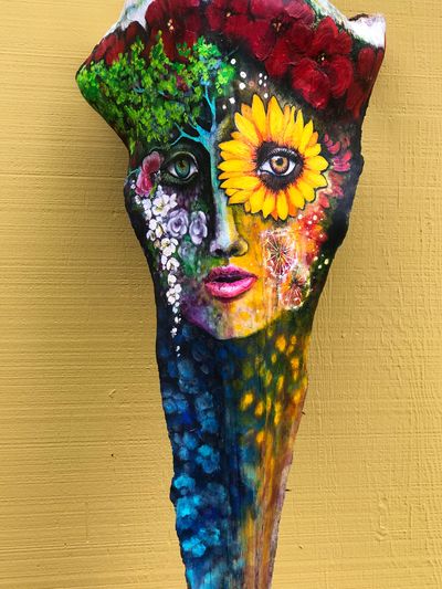 This piece honors transformation as a lifelong unfolding; the way we carry every season within us, each one shaping who we are and who we are becoming. The cool blues and branching light evoke winter’s clarity, the quiet wisdom of stillness, and the cleansing that comes through pausing and shedding. The warm reds and golds, alive with blossoms and summer’s radiant energy, reveal how beauty opens in its own time, expanding into the full essence of becoming. Flowers and roots intermingle across the surface, showing how each season leaves its mark and how color and shadow, growth and rest, and life and death coexist in every living being. Branches extend outward like an aura, a reminder that we are woven into nature’s endless turning.