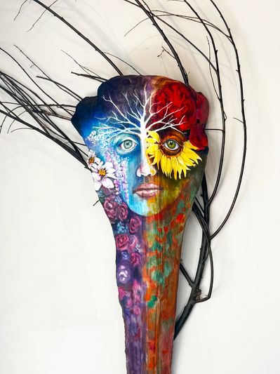 This piece honors transformation as a lifelong unfolding; the way we carry every season within us, each one shaping who we are and who we are becoming. The cool blues and branching light evoke winter’s clarity, the quiet wisdom of stillness, and the cleansing that comes through pausing and shedding. The warm reds and golds, alive with blossoms and summer’s radiant energy, reveal how beauty opens in its own time, expanding into the full essence of becoming. Flowers and roots intermingle across the surface, showing how each season leaves its mark and how color and shadow, growth and rest, and life and death coexist in every living being. Branches extend outward like an aura, a reminder that we are woven into nature’s endless turning.
