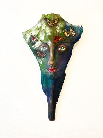 Mariposa captures the moment when the inner world begins to stir into light. A face emerges from the forest’s greens and shadows, eyes wide with quiet wonder. Monarchs gather around her like messengers of change, their wings carrying the promise of transformation and the courage to open into what’s next. Soft blossoms drift across her skin, blurring the boundary between human and nature. This piece honors the tender threshold between who we have been and who we are just beginning to become.